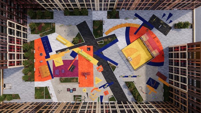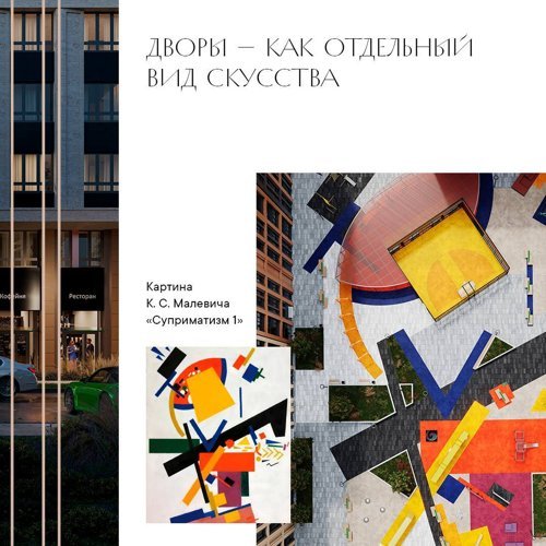 Олицетворяет гармонию вневременного творчества и современных инноваций. Перформанс-дворы в виде картин великих художников: Малевича, Кандинского и других гениев искусства. Вдохновение эстетикой формы и цвета будет наполнять жизнь резидентов каждый день.