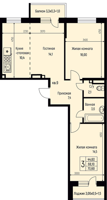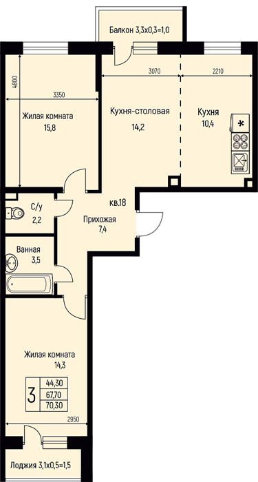 Площадь от 70.1 м2