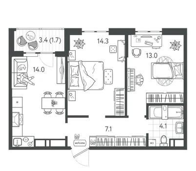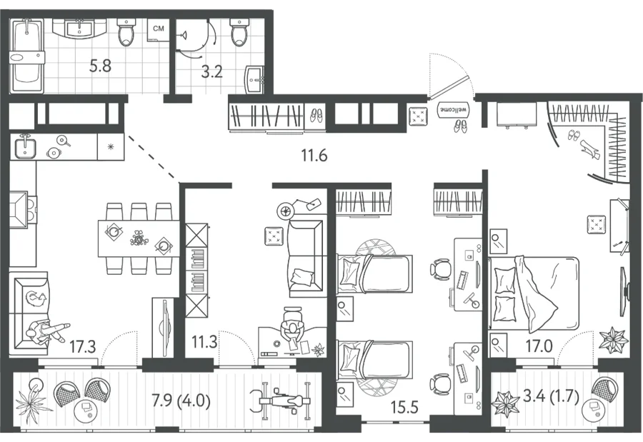 Площадь от 55.3 м2